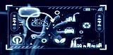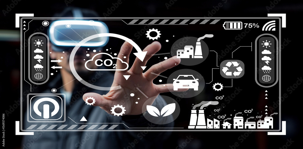 Virtual reality interface showcasing environmental data visualization with a focus on carbon emissions, sustainability, and technological innovation