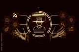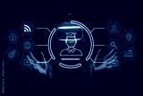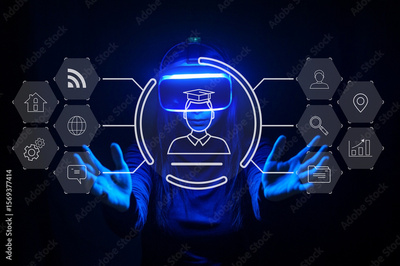 Futuristic Virtual Reality Interaction with Technology Graphics and Engaged User in Neon Glow Setting in Dark Environment