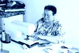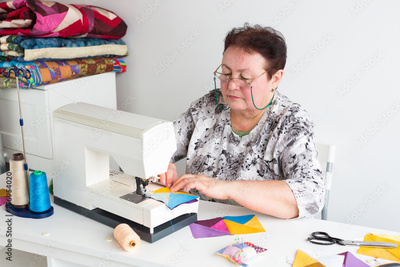 needlework and quilting in the workshop of a tailor - older woman with glasses works at a desk with a sewing machine and thread, fabrics, needles, pins, buttons, scissors, rotary cutters