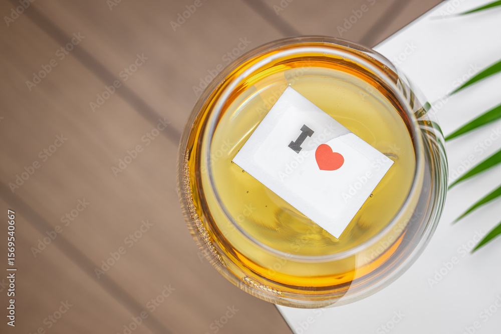 A close-up top view of a glass of white wine with a small paper note featuring love symbol floating inside, creating a romantic and playful atmosphere