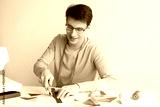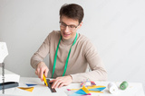 quilting and patchwork at the workshop - young tailor male sitting at desk and cut out colorful pieces of fabrics for sewing patchwork items, lay next to spools of thread and scraps of fabrics.