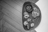 Grilled pork steak served with colorful grilled vegetables, pineapple slice, fresh rosemary, and a side of tomato sauce on a stylish black plate