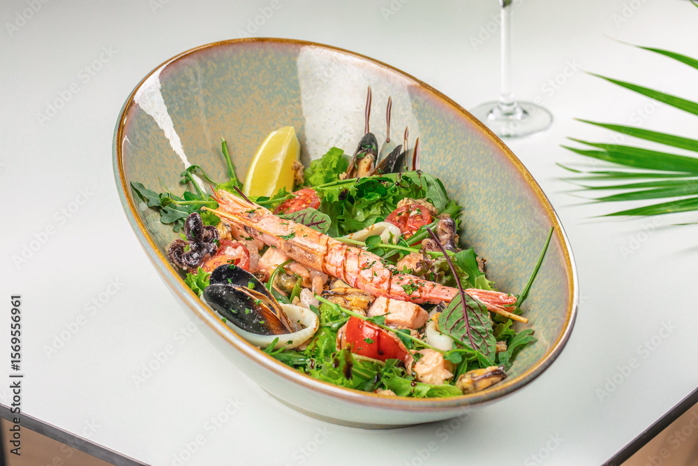 A fresh seafood salad with grilled shrimp, mussels, squid, salmon, and mixed greens, garnished with cherry tomatoes, lemon wedge, and herbs for a vibrant and healthy dish