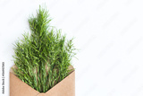 opened craft paper envelope filled with green cereal ears of grass. concept of healthy lifestyle. offer of organic natural food. care of the environment. Empty space for the text. flat lay.