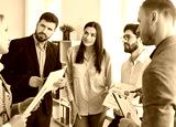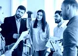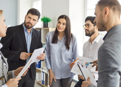 Corporate business team having a work meeting in the office. Group of young people standing together, discussing work and exchanging professional experience