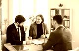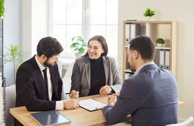 Portrait of cheerful happy young couple sitting in office with male agent going to sign a contract. Man and woman reaching agreement with realtor or financial advisor sitting at desk on workplace.