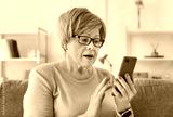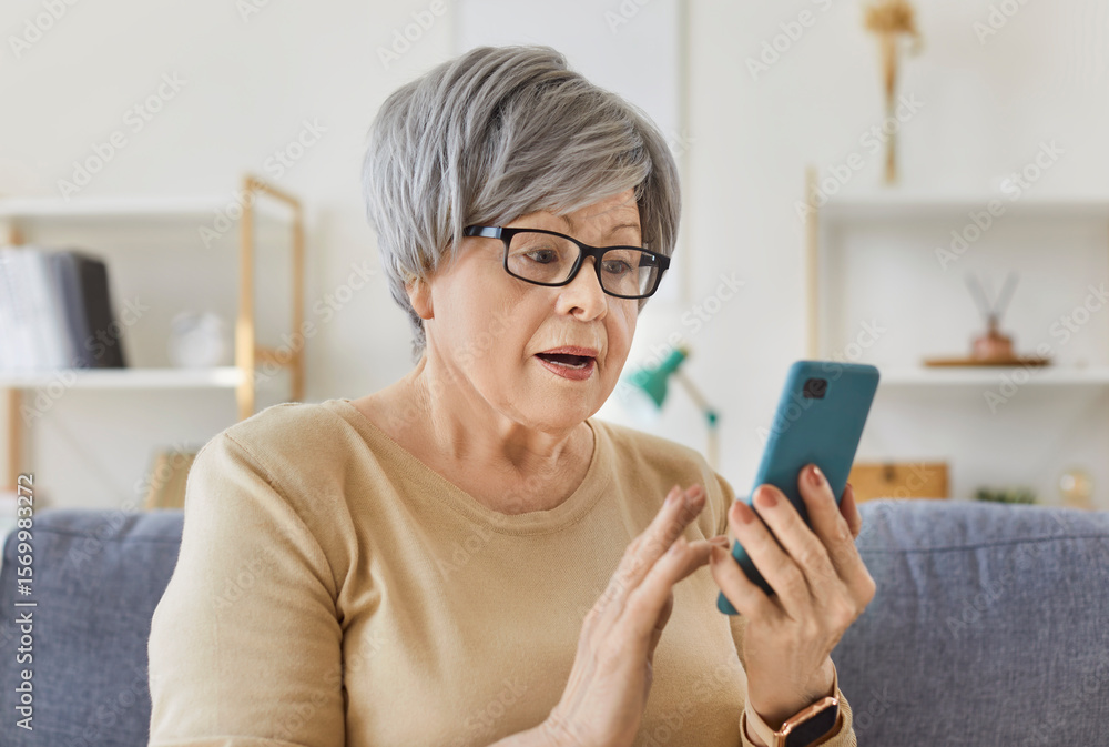 Annoyed senior old woman worry, elder phone user staring at screen in surprise of app error, data stealing, scam, bad family news, problems with smartphone, unable in using cell for video call