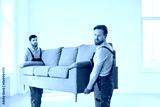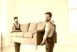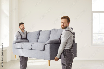 Professionally trained furniture movers, delivering sofa, upholstery, repair services advertisement, relocation at home placing new modern comfy couch in living room, office moving day renovation