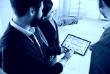 Architect or interior designer showing on tablet new apartment online plan to couple at meeting, realtor consulting customers making real estate offer, mortgage loan investment, repair planning