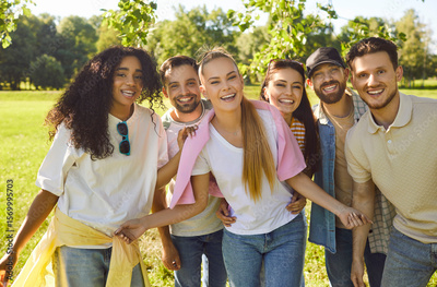 Young friends, diverse group of young people together fun, posing for team photo enjoying happy and friendly outdoor sunny day walking in green grassy park, relaxed and joyful atmosphere, celebrating