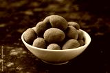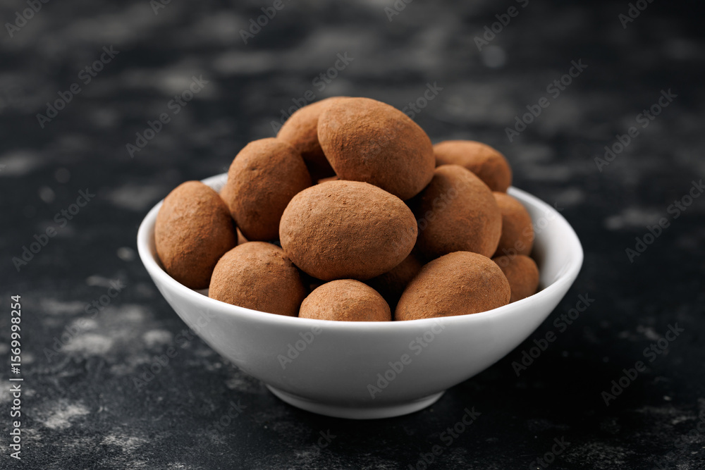 Chocolate coated almonds in white bowl. Cocoa coated almonds. Cocoa Dusted Almonds