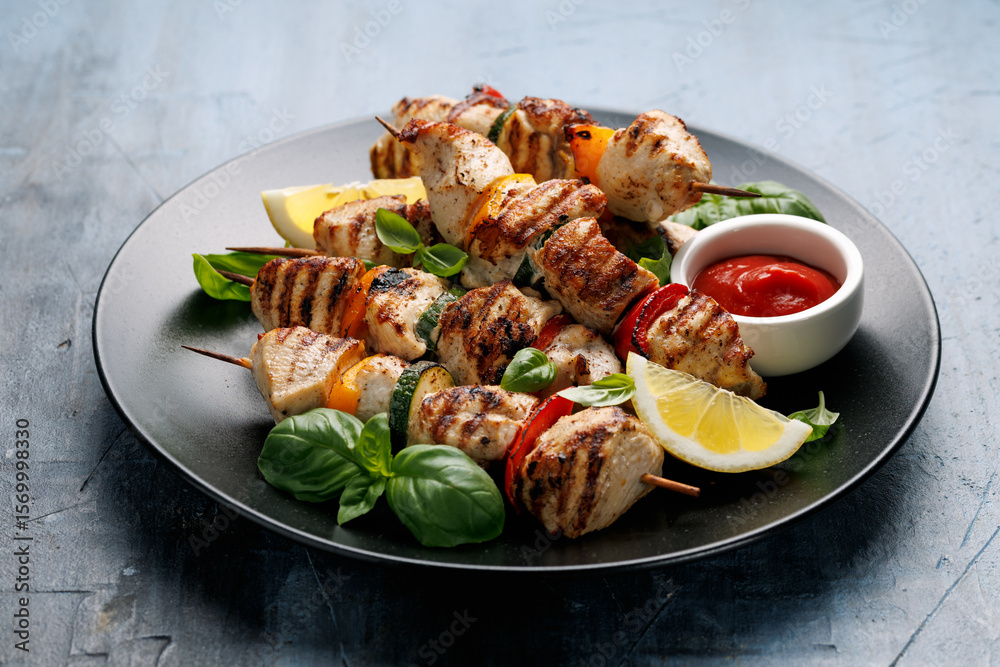 Chicken kebab skewers on a plate with vegetables. Mediterranean healthy food