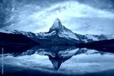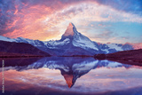 Stellisee lake glows at sunset with perfect Matterhorn reflection in clear alpine water. Swiss Alps evening view near Zermatt with golden light and snowy peak