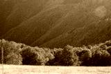 Red beech forest glowing by setting sun in autumn mountains. Landscape photography