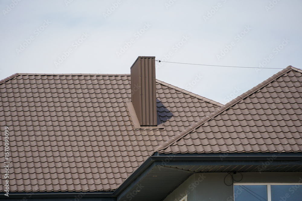 A brown tiled roof features a sleek chimney structure, blending contemporary design with suburban architecture under a bright sky