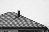 A residential roof is visible, featuring textured tiles and a chimney under a clear blue sky. Electrical cables are seen in the background, suggesting suburban life