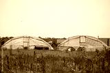 Two large greenhouses stand on a farm, partially covered in fabric, surrounded by lush green grass and small buildings in the background, during a sunny day