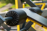 Brightly lit outdoor gym features sturdy workout equipment ready for use in a community park during a clear, sunny afternoon
