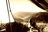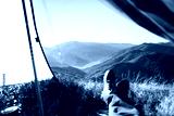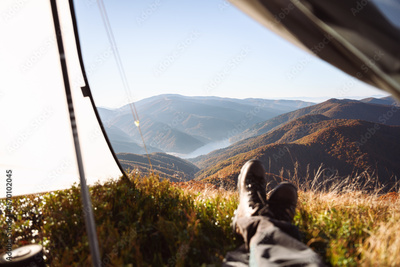 Hiker resting in his tent in highlands and overlooks mountain lake in bright fall weather. Legs in hiking boots sticking out of the tent in autumn mountains
