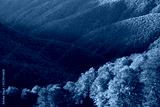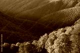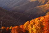 Evening sun sets over red beech forest in colorful autumn mountain landscape. Seasonal light reveals deep tones in a peaceful nature photography scene