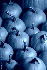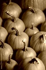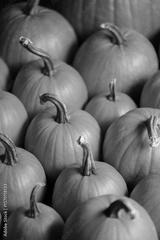 Close up of multiple orange pumpkins packed tightly in warm autumn tones. Halloween background with rich texture and cozy seasonal still life