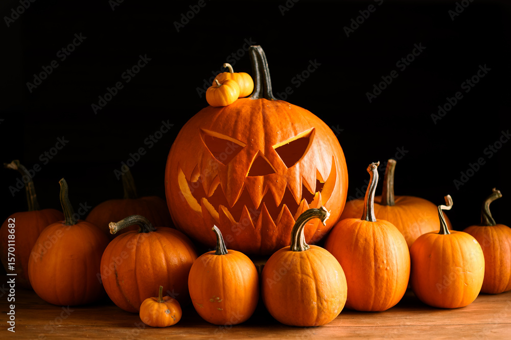 Carved jack-o-lantern surrounded by mini orange pumpkins on black background in Halloween setup. Festive fall decor with spooky mood and seasonal celebration