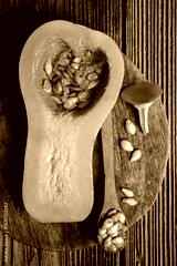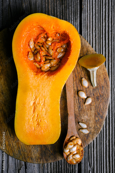 Butternut squash half with wooden spoon and seeds on wooden cutting board. Overhead autumn scene ideal for cooking content or seasonal food photography