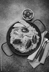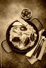 Seafood paella with rice, shrimp, mussels, peas, and lemon wedges served in a black traditional pan on a dark rustic background with olives and cutlery