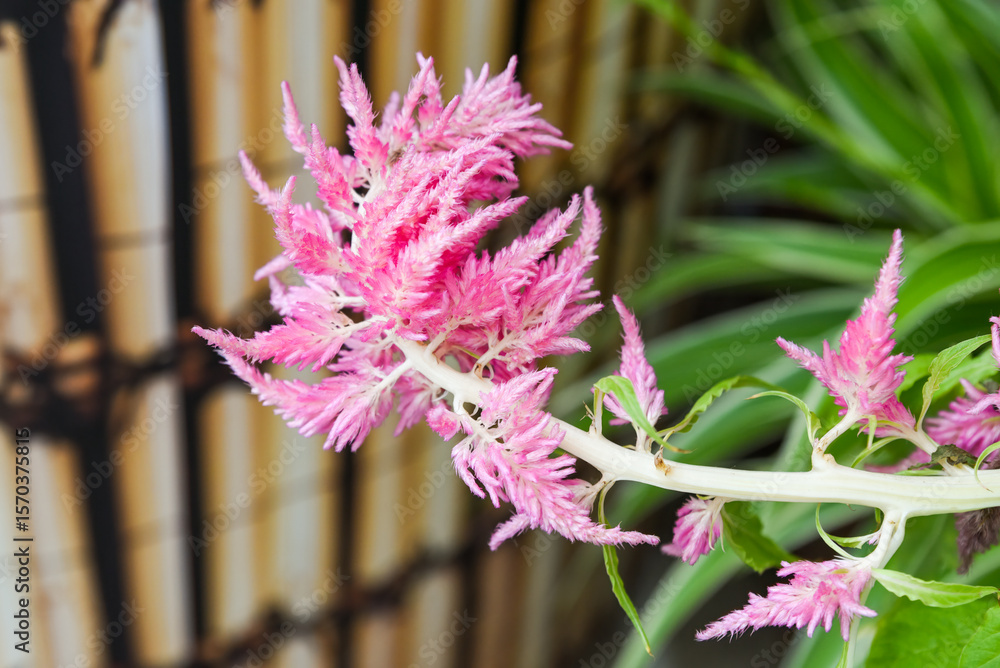 Bright pink feathery Celosia flowers on a pale stem, captured in close-up with a blurred bamboo and foliage background.