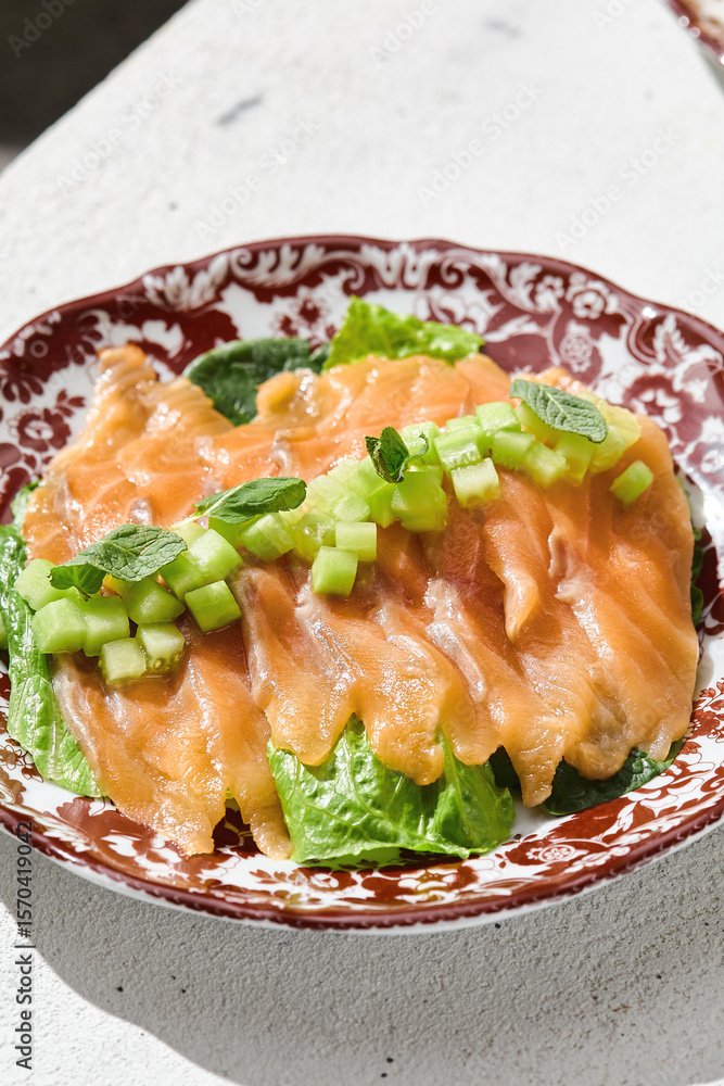 Salmon with romaine and cucumber, bright natural lighting, overhead composition