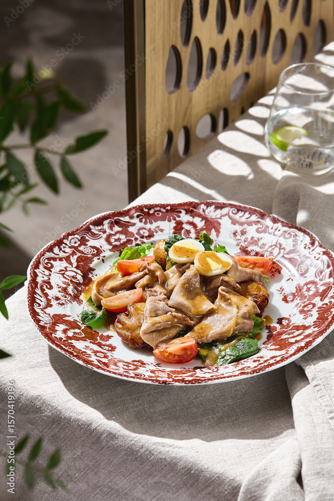 Beef tongue salad with mustard sauce, bright natural lighting, elegant overhead composition