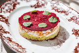 Herring under beetroot salad, bright daylight, elegant overhead ceramic plate composition