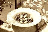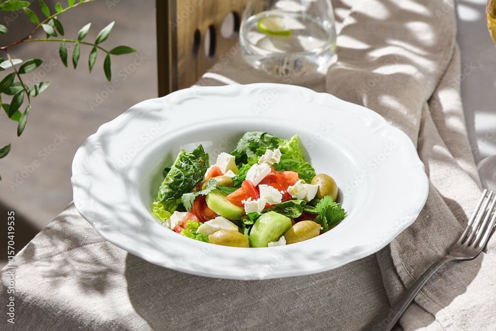 Greek salad in white bowl, sunlit bright mood, styled tabletop overhead composition