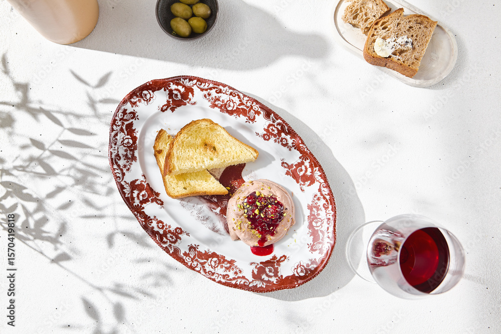 pate with berry sauce and brioche in bright overhead flatlay composition
