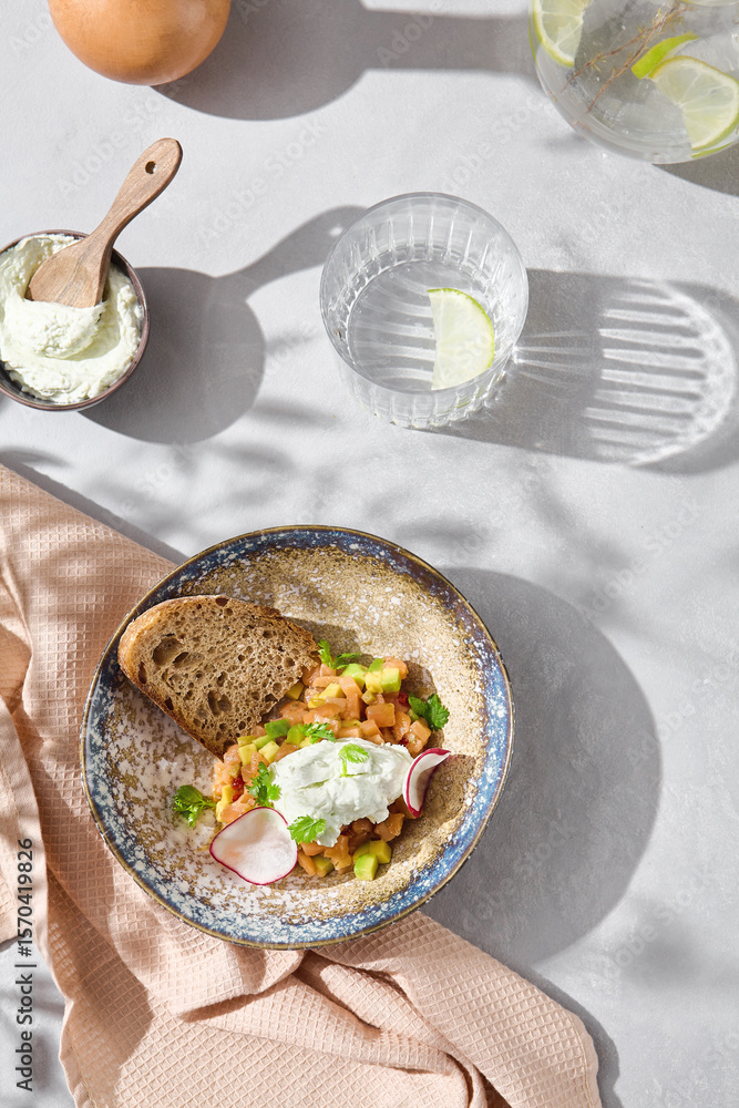 Salmon tartare with stracciatella and toast in bright overhead minimal flatlay composition