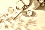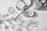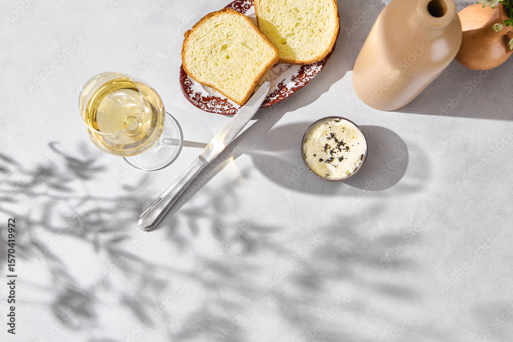 Brioche slices with butter, bright sunlight, minimalist overhead composition