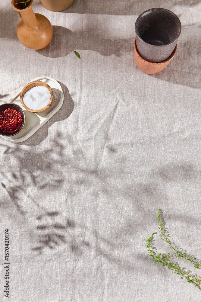 Linen tablecloth with scattered spices, bright natural lighting, overhead minimal composition