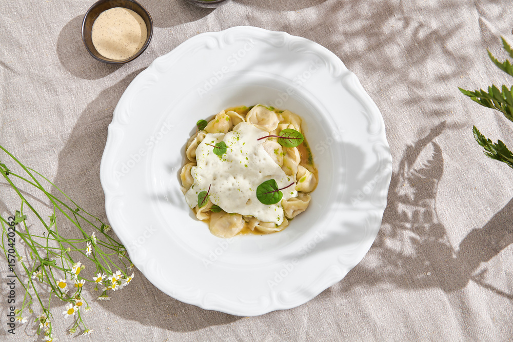 Pelmeni with cheese espuma in bright rustic lighting, overhead composition on linen tablecloth