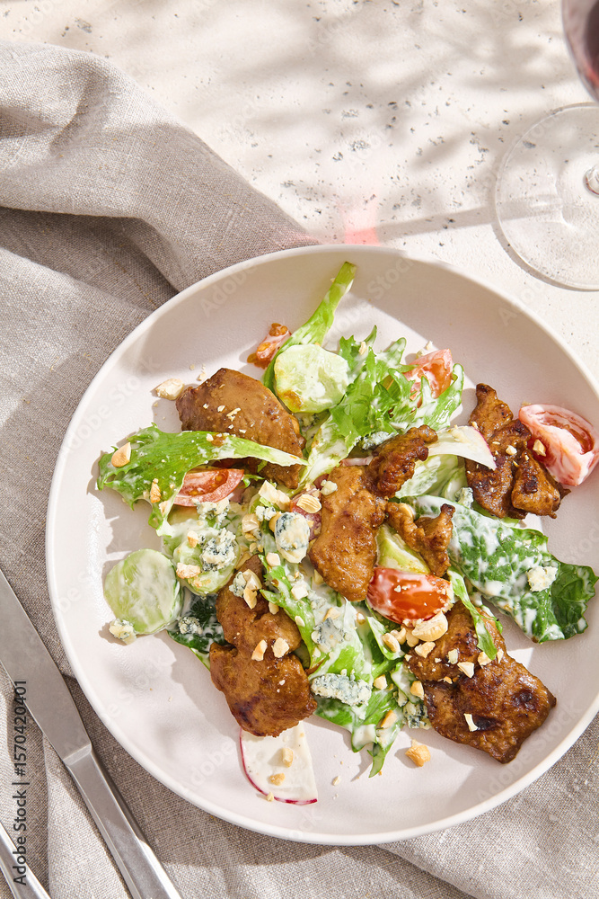 Chicken liver salad in bright lighting, overhead composition on a ceramic plate