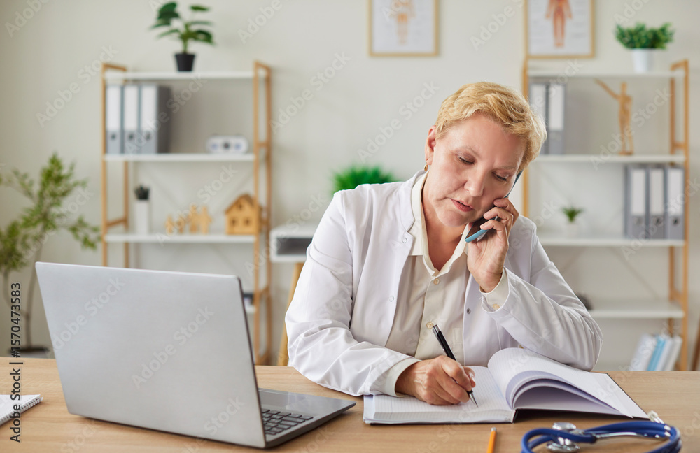 Focused senior female doctor in white coat sitting at desk with laptop while talking on mobile phone with patient. Professional mature cardiologist making appointment and taking notes in notebook.