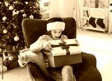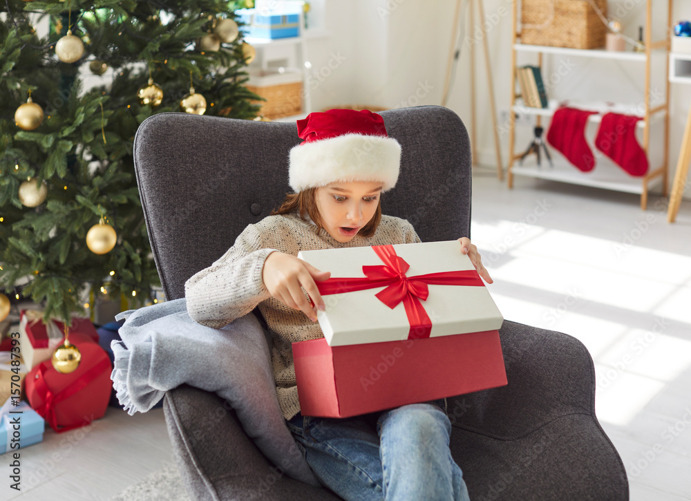 Young boy opens a gift box at home during Christmas or New Year, filled with surprise and excitement. The celebration highlights the joy of receiving presents during the holiday season.