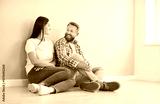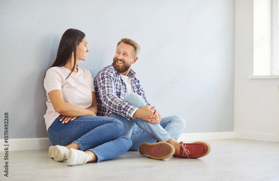 Happy young family couple sitting on floor against wall, celebrating purchase of new home together. Smiling man and woman excited about their new estate and preparing to relocation or home repair.