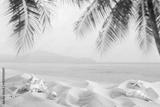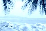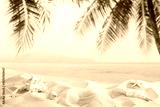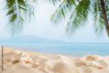 Light tropical sand beach with shells against blue sky and palm leaves as natural blurred background