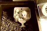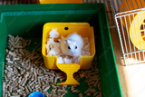 Cute white hamster sits comfortably in a yellow plastic house inside a green cage filled with wood pellets. A small pet rodent in its home environment, looking cozy and peaceful indoors.