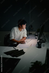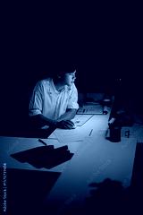 Businessman working late alone in a dark office, focused on computer screen under artificial light