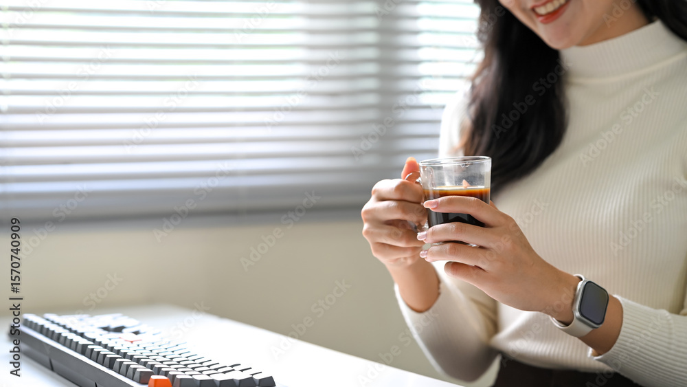 Smiling woman holding a glass cup of black coffee during a work break at her desk