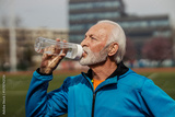 Side view of thirsty senior sportsman drinking water on stadium during a break.