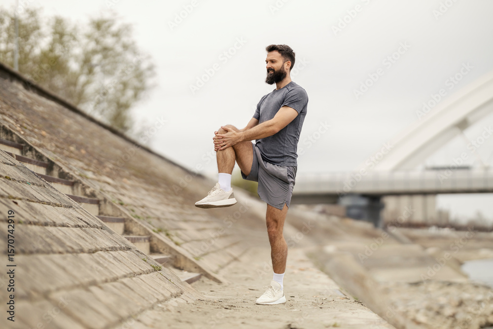 Full length of sportsman in shape stretching his leg and balancing on one foot near riverside.