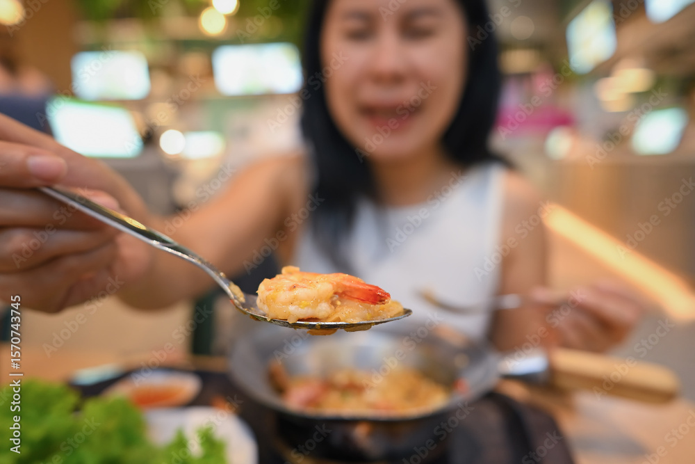 Smiling woman extends a spoonful toward the camera in a warm, inviting gesture