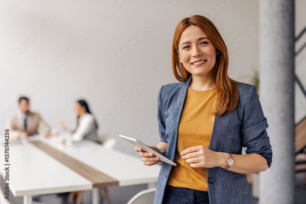 Portrait of happy businesswoman standing at corporate office during the meeting and smiling at camera.